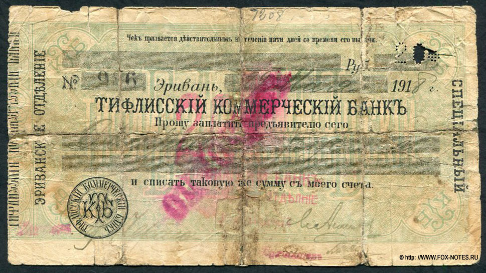 Эривань. Кавказский Банк. Чеки 1918