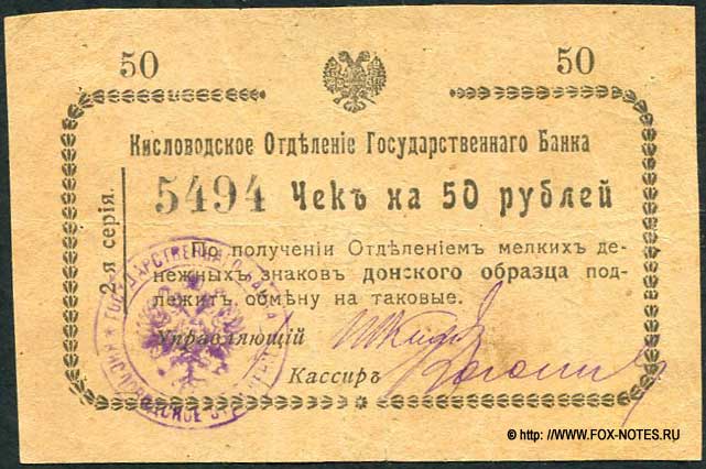 Кисловодское отделение Государственного банка. Чек на 50 рублей. По