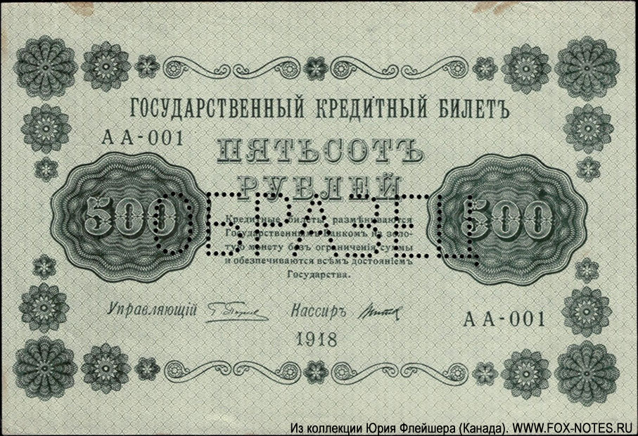 достоянием Государства. Управляющий. Кассир. 1918. Основное изображение оборотной стороны - Рамка из гильошей. В середине двуглавый орел без
