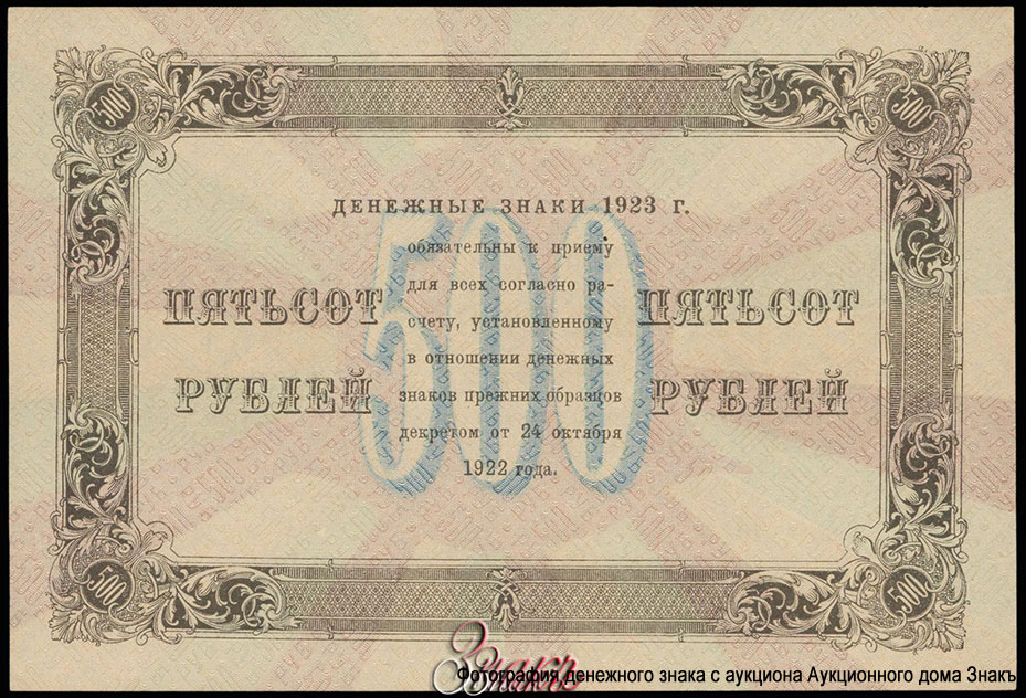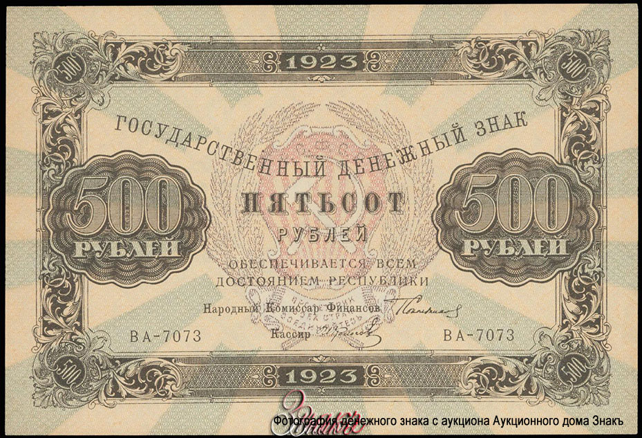 ПЯТЬСОТ РУБЛЕЙ. ОБЕСПЕЧИВАЕТСЯ ВСЕМ ДОСТОЯНИЕМ РЕСПУБЛИКИ. НАРОДНЫЙ КОМИССАР ФИНАНСОВ.