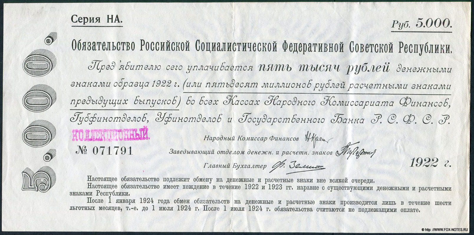 РСФСР, обязательство 5000 рублей образца 1922 г, серия АА |