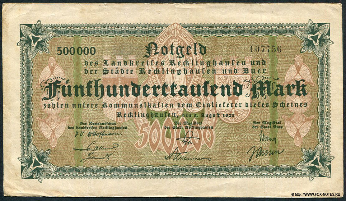 Landkreis Recklinghausen, Stadte Recklinghausen und Buer notgeld 500000 mark