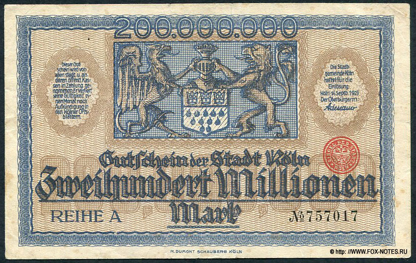 (Кёльн), Rheinprovinz (Rheinland), Königreich Preußen / Freistaat Preußen. Нотгельды Германии 1914 - 1924