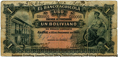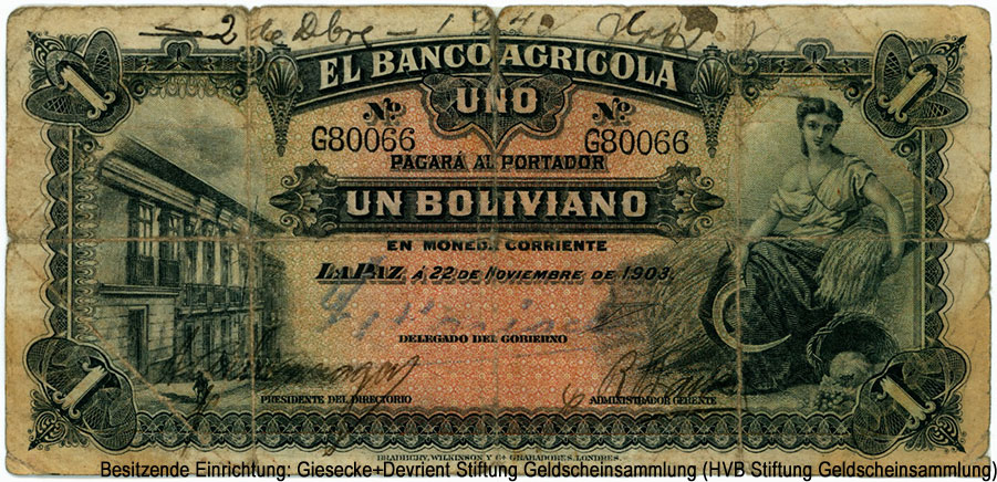 1 боливиано — 22 DE NOVIEMBRE DE 1903. 148 х 71 мм.