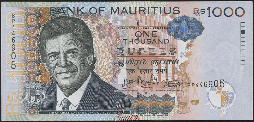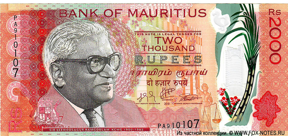 5 рупий — ND(1985). Пдпс.: Sir I. Ramphul, Mr.