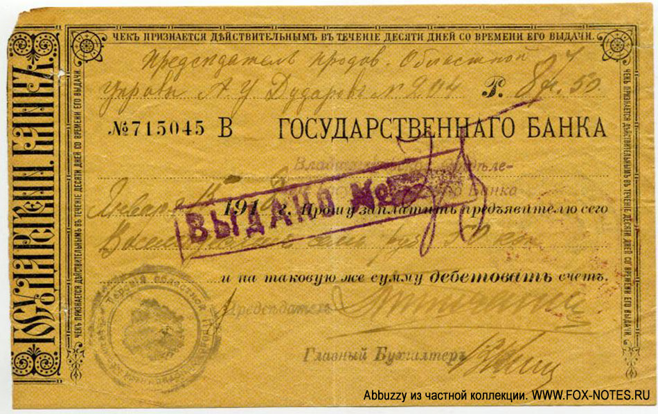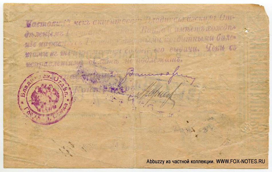 Текст: Настоящій чекъ акцептованъ Владикавказскимъ Отделеніемъ